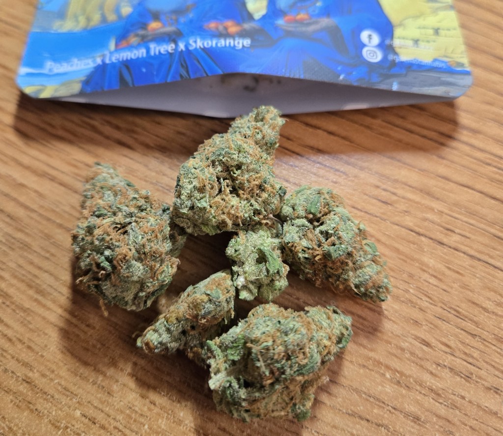 The lineage on this one is listed different on the front and back of the bag. Printed on the front alongside the graphics it says Peaches x Lemon Tree x Skorange. On the back of the bag, the white sticker with all of the THC and terp info says Spanish Barbara x Lemon Tree Skorange. Maybe those two lineages are actually the same lineage written in two different ways, I’m not sure.